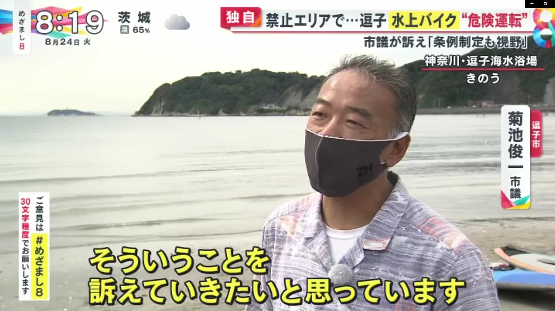 - 水上バイク対策でテレビ取材、逗子海岸の現状を訴える(2021,2023年)